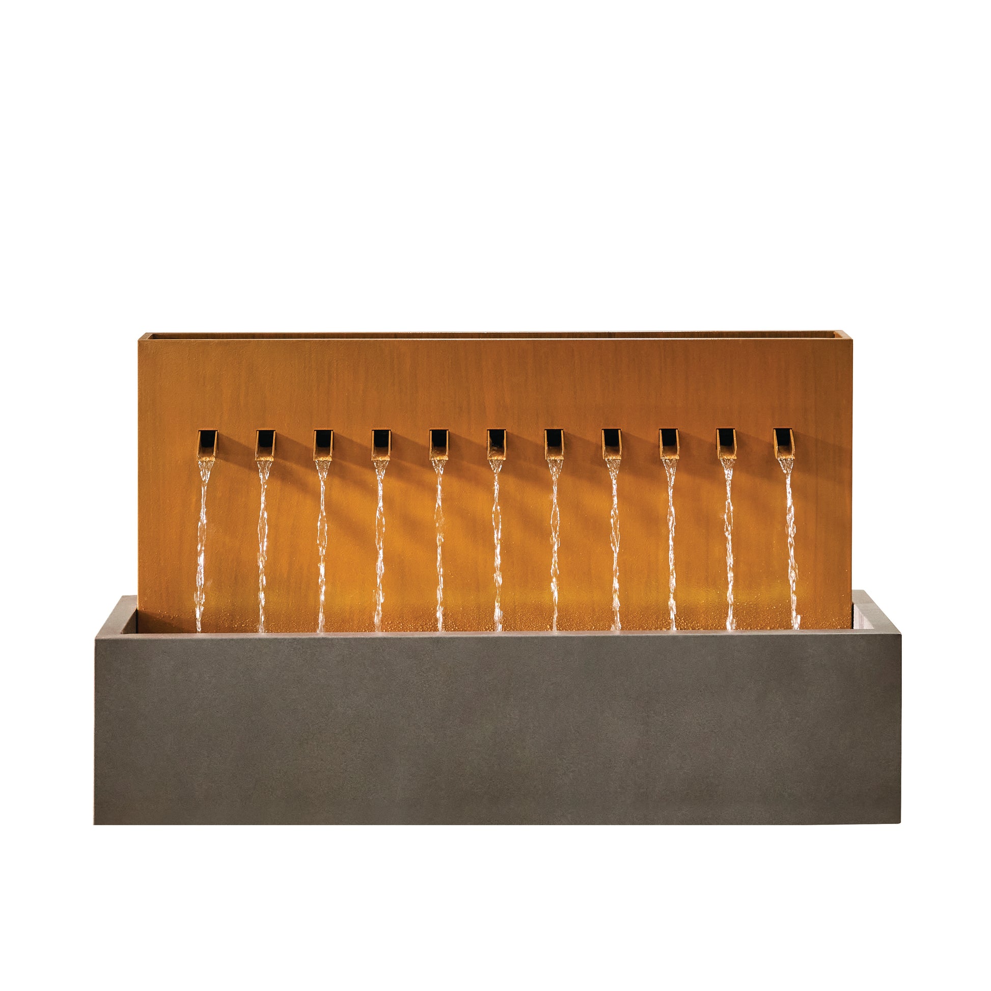 - Made from metal with an oxidised-effect fountain wall and a dappled grey base. Water flows from 11 spouts into the trough below