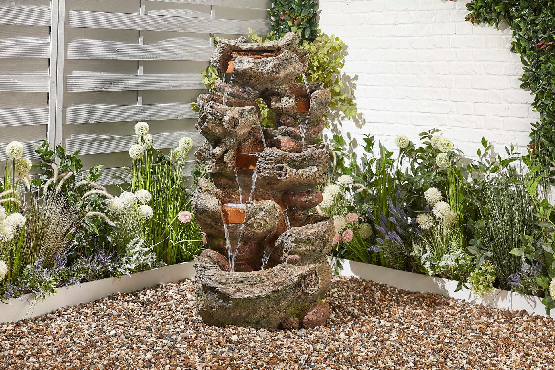 A cascading, hollowed out tree design with 8 pouring waterfall sections
