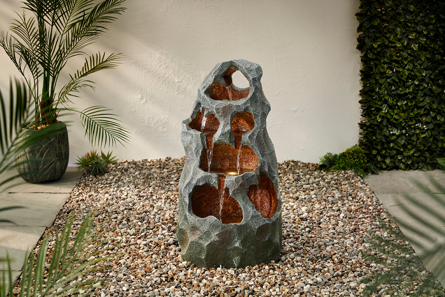 - Softly cascading water simulates the sound and appearance of a natural cave water fall